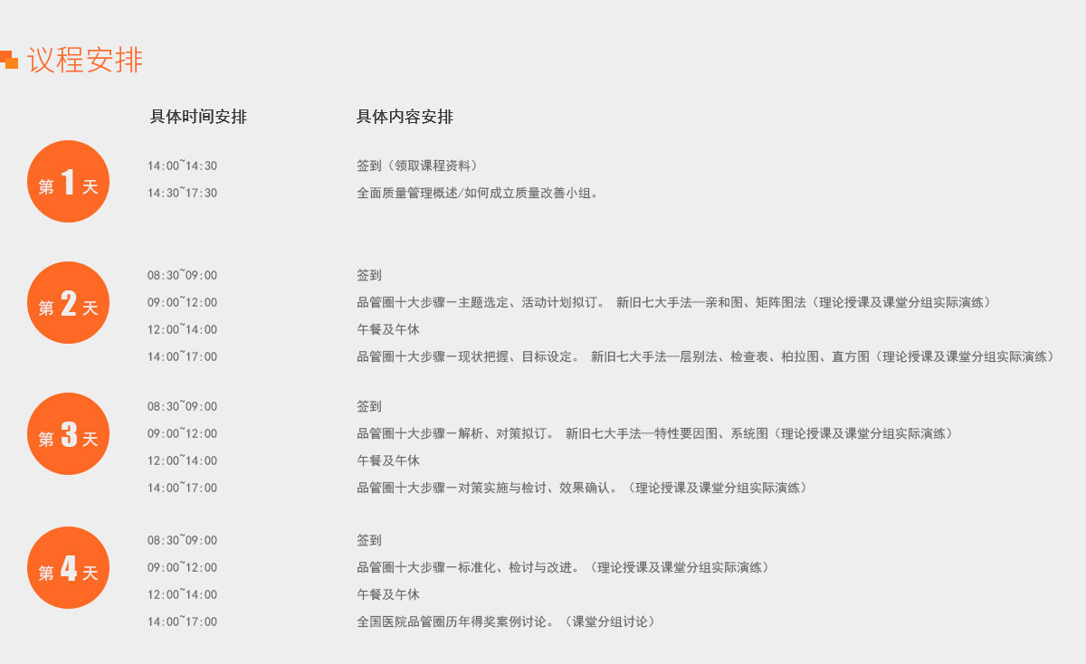 1、成果导向: 以训练出一批有能力组织圈员,成功改善科室问题的专业品管圈圈长为课程 目标; 2、人才交流: 有来自大陆和台湾的讲师和学员,可对医院品管圈的实施进行充分交流,互 相促进; 3、成功分享: 提供成功经验分享,站在巨人的肩膀上,与成功为伴; |